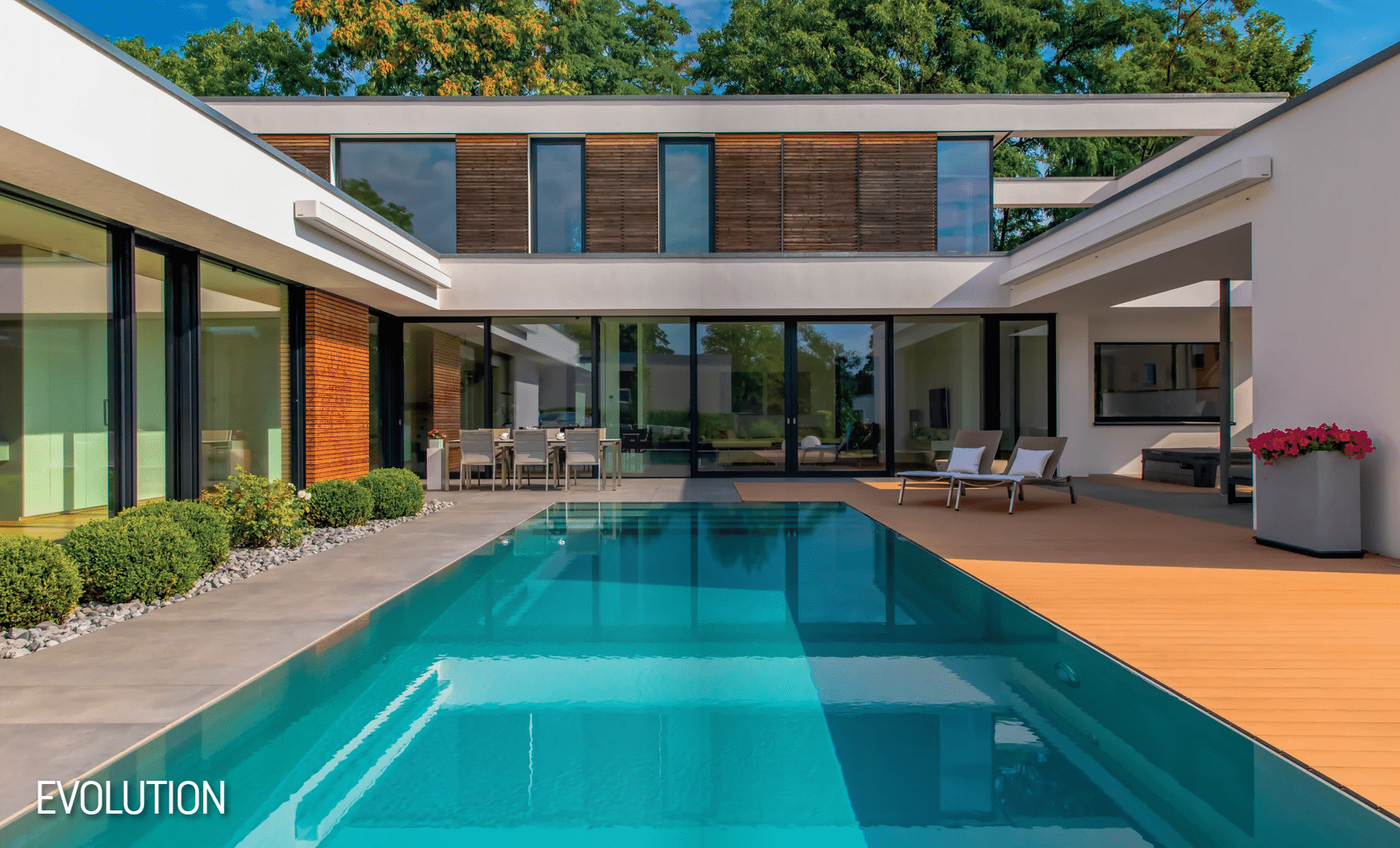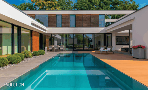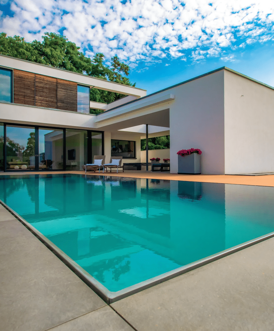 Die elegante Pool-Silhouette geht fließend in die Wasserfläche über. Die schmale Kante des Überlaufpools Evolution überzeugt mit minimalistischem Design und klaren Linien.